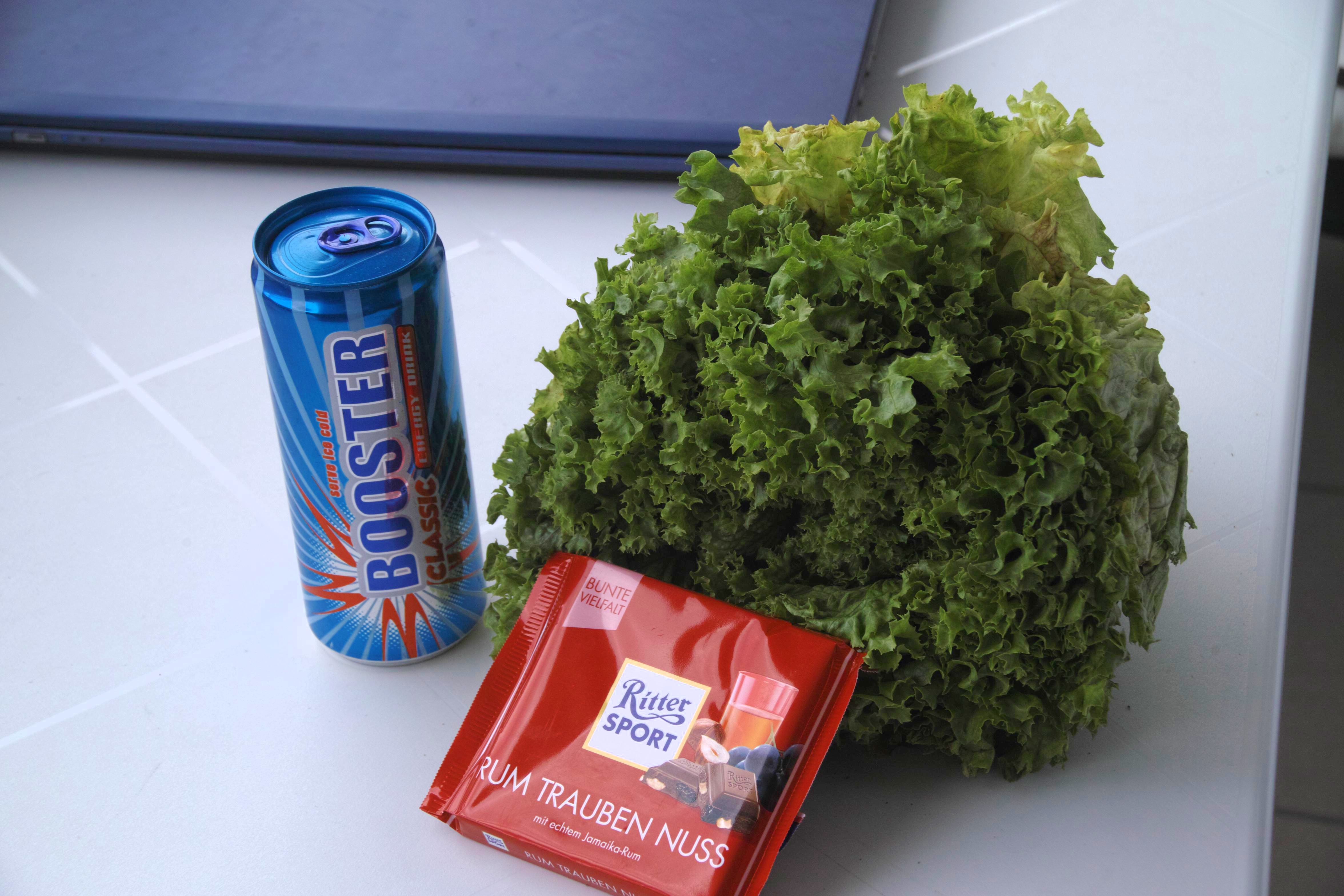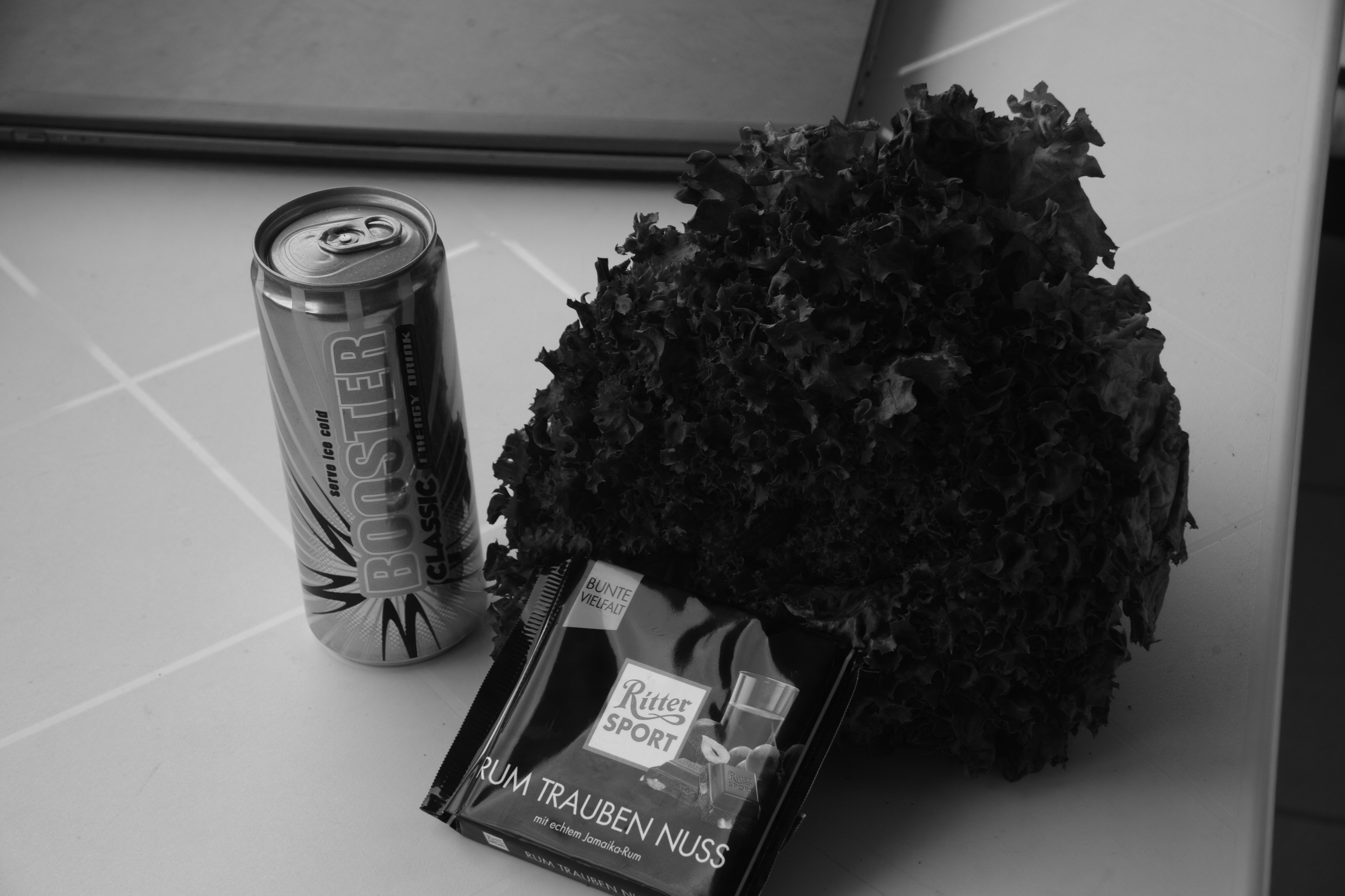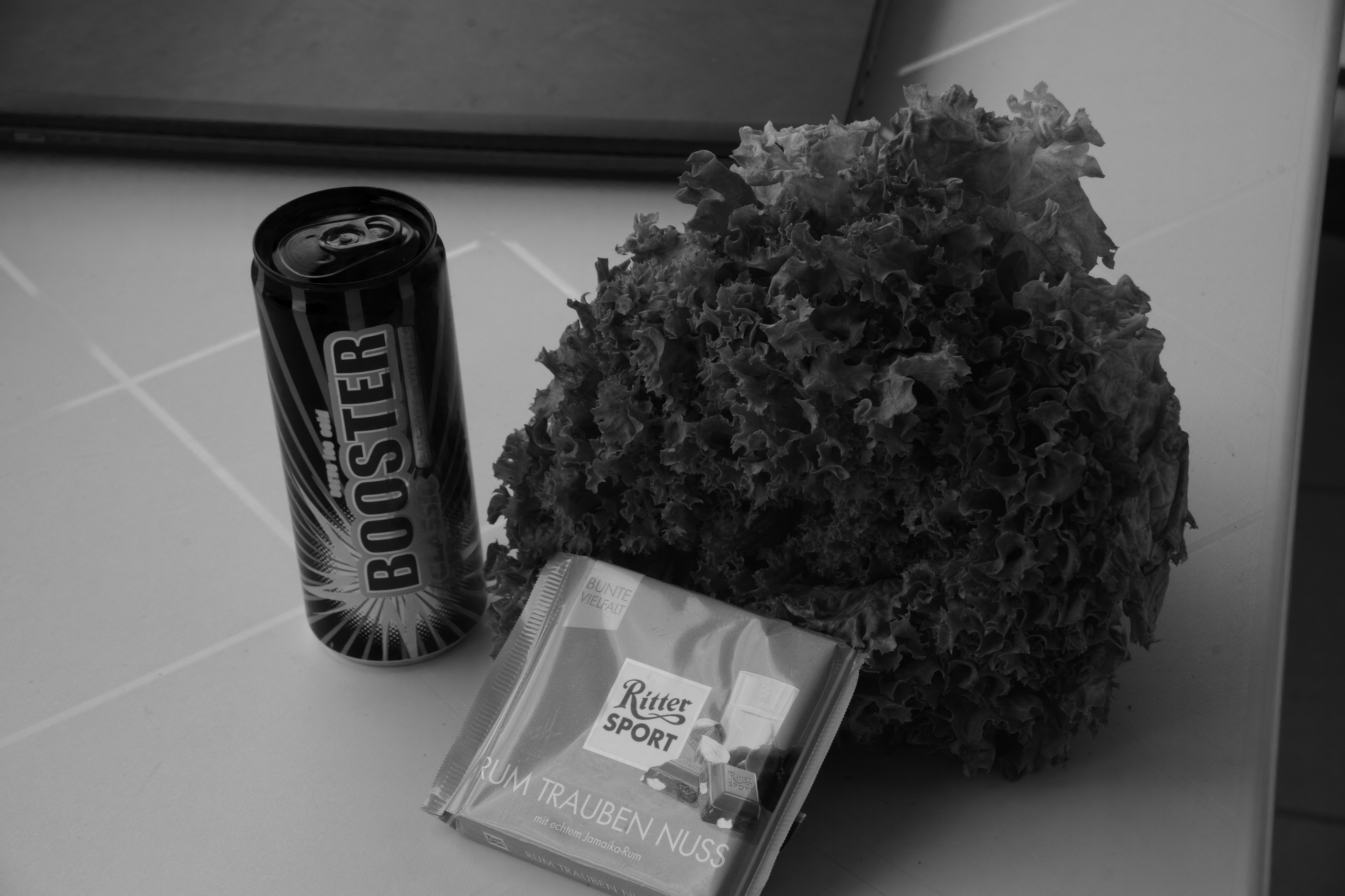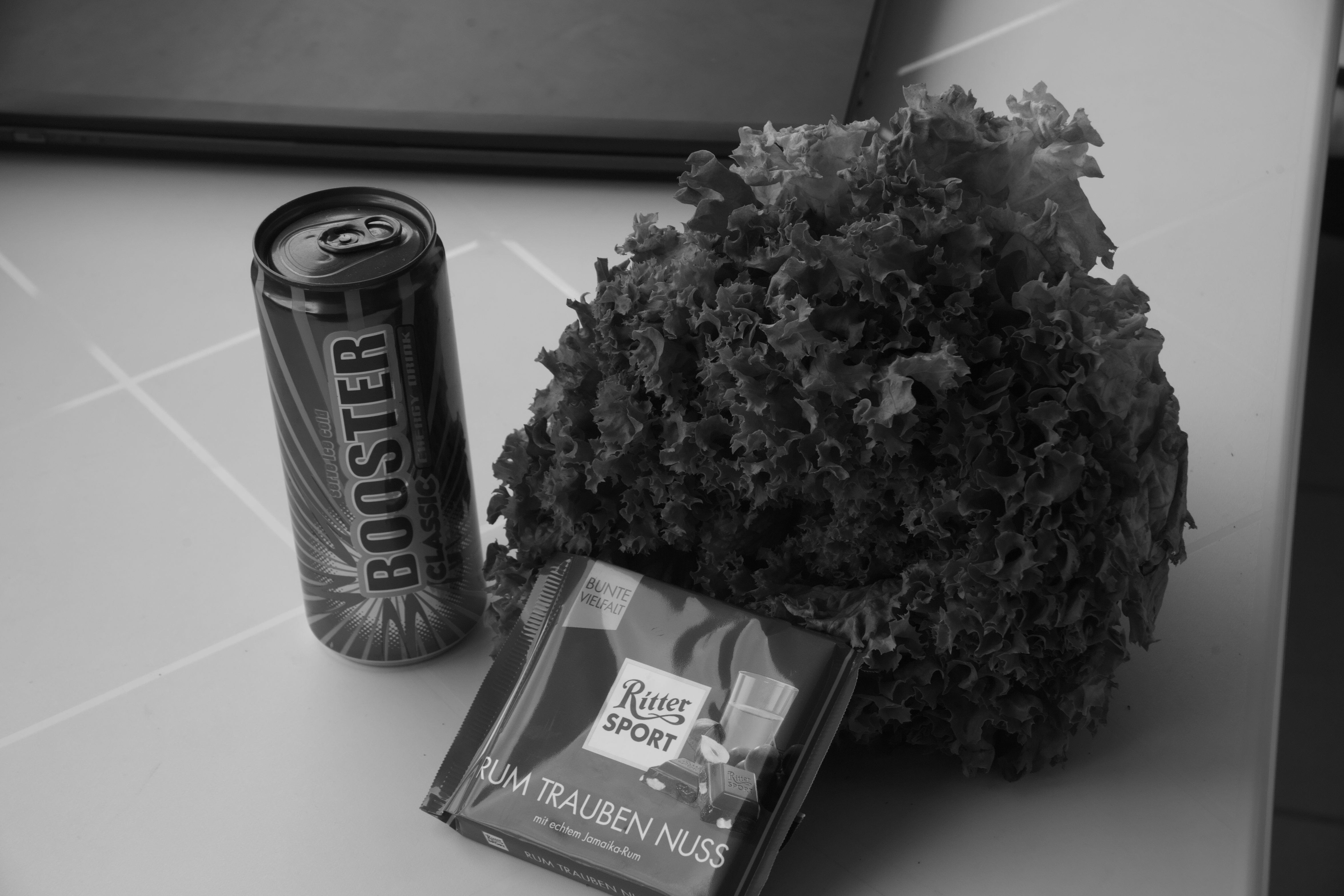 Sehen wir uns mal ein ein Monochromreferenzbild mit allen 3 Schichten an von einer roten Tafel Schokolade, einem grünen Salatkopf und einer blauen Dose (auch der Lapi im Hintergrund ist eisblau). Alle 3 Farben kommen hell hervor, ein Zeichen, daß alle 3 hochspezialisierten Schichten ihren Beitrag leisten: